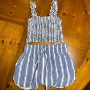 Chic navy and white textured top. Features ruffled straps. Matching shorts.