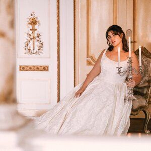 The Belle-inspired gown features a timeless ballgown silhouette, corset closure bodice and scoop neckline, covered in a stunningly rich floral brocade. A gown truly fit for a princess.�