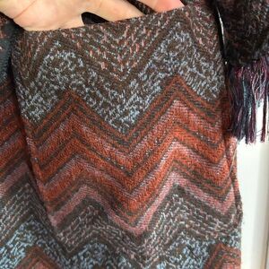 Embrace warmth and style with this chevron open front cardigan. Featuring rich red, gray, and brown tones, it's perfect for any casual outing. The fringe details add a unique touch. all proceeds from this item go to support mental wellness and suicide prevention. Thank you for considering this purchase.