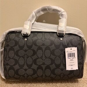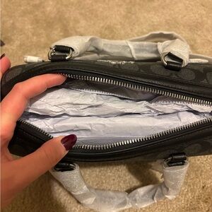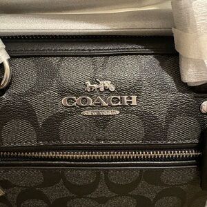 Elegant Coach satchel in black. Features iconic logo pattern and silver accents. Perfect for any occasion.