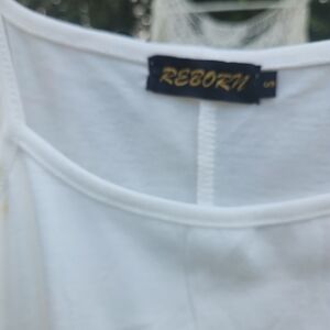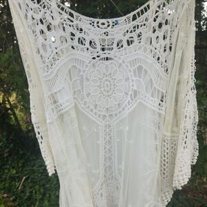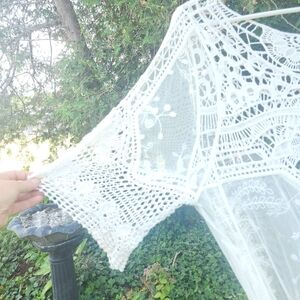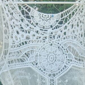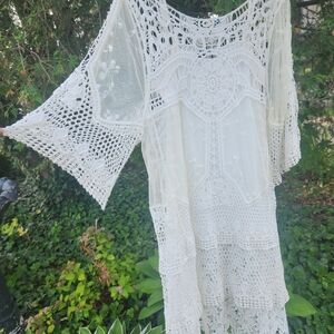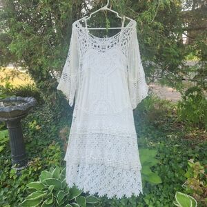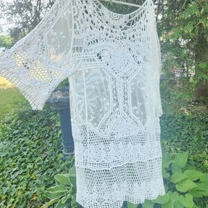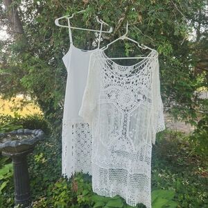 Dreamy white crochet look lace dress/top and lining dress with lace hem. Ideal for elegant events. Stain on under dress at arm area. I haven't tried cleaning it.