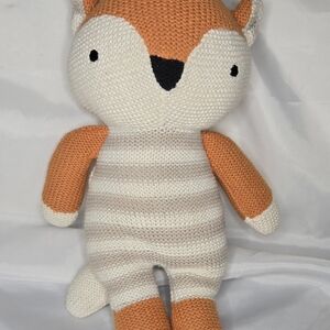 Delight your child with this adorable orange and white knitted fox plush toy. Perfect for cuddling and imaginative play.