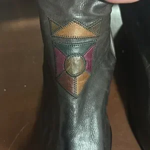 These unique booties have a slightly slouchy shape and geometric panel design that adds character and charm. A rare find for lovers of vintage, boho, and indie fashion.