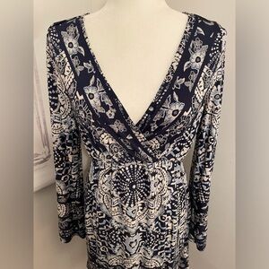 This boho style dress is in great preloved condition. I did cutout the care and material tag. It features bell sleeves, a wrap style v-neck front, elastic at the waist, and above the knee length.