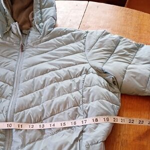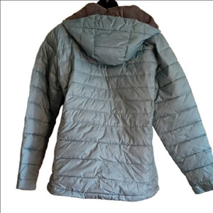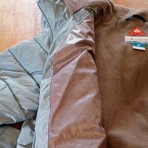 Warm and stylish puffer Columbia jacket. Perfect for winter days. Beautiful light blue with silver lining.. Size large. Good used condition, no flaws.