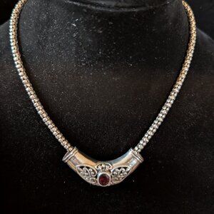 This unique piece of jewelry is in perfect condition. The chain is 17.5" and the slide pendant features a deep red garnet. Thanks for looking!
