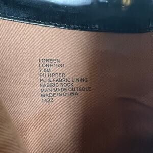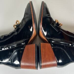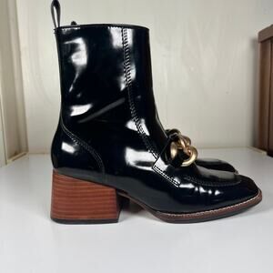 Features: side zipper, chunky chain across the front, square toe, block heel, synthetic leather.