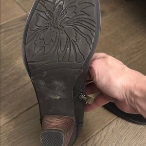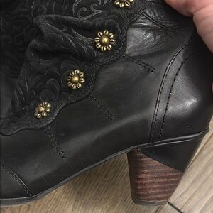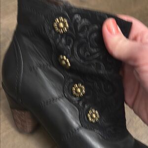Step out in style with these elegant black leather ankle boots. Featuring intricate gold accents, these boots offer both comfort and sophistication. Perfect for any occasion.