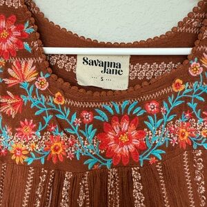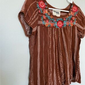 Chic brown top with vibrant floral embroidery. Perfect for any occasion.