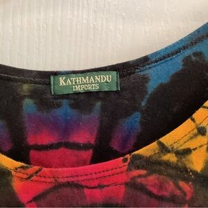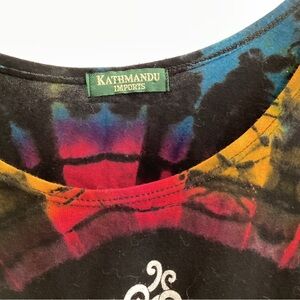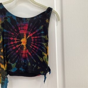 Vibrant crop top with Om symbol. Features multicolor tie-dye design. Perfect for casual wear. No size tag but worn by XS person.