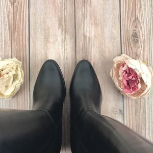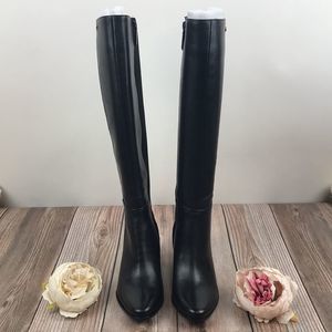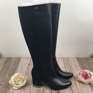 Chic black boots with white trim. Features a stylish block heel. Iconic Calvin Klein logo detail.