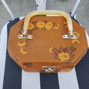 Charming wooden handbag with vibrant floral design. Features a sturdy handle and secure clasp. Perfect for adding a vintage touch to any outfit. Please review photos, has signs of wear