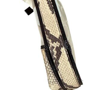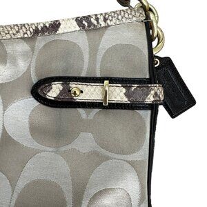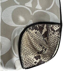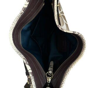 Description: Add a touch of luxury to your collection with this pre-loved Coach Colette Hobo Bag, style 16408. Crafted in a Pale Khaki Natural Signature Logo Sateen, this purse features eye-catching snake skin corners and accents, making it a standout accessory for any outfit.