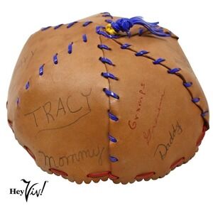 Vintage Child Size Brown Leather Beanie Cap w Family Friends Autographs -Hey Viv