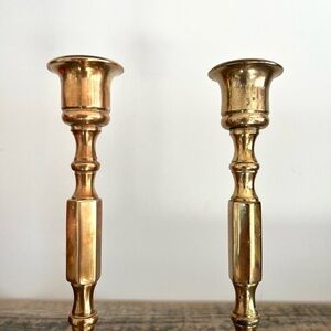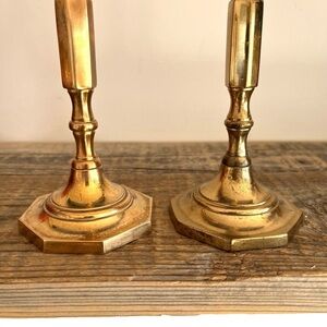 Solid brass candlesticks set of 2. Pretty set. Dessau Brass, Made in India. Please note the brass color and patina has caused these to be slightly busy different in color. There’s some patina spots present. Otherwise in nice vintage used condition. Octagon bases