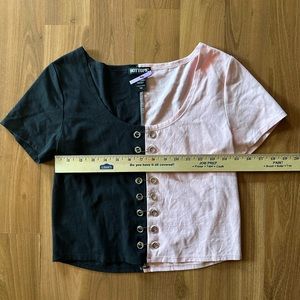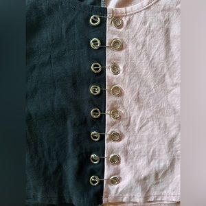Super flattering short sleeve t-shirt with a two-tone black and pink split with safety pins and grommets. I always get a ton of compliments on this shirt but it no longer fits.
