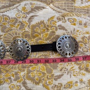 Stylish silver concho belt with intricate design and black strap. Perfect for adding a statement to any outfit. heavy metal. brand new
