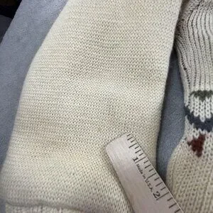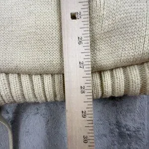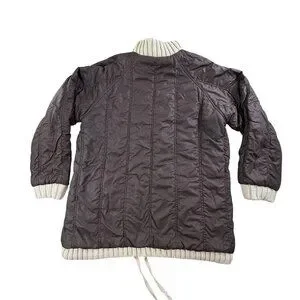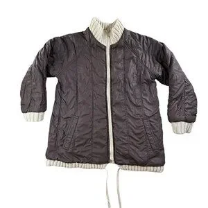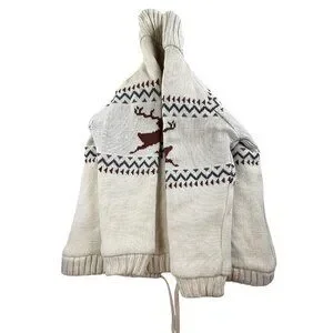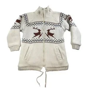 Unique reversible jacket: One side features a cream/tan thick knit wool blend with brown and dark green intarsia deer pattern; the reverse is a brown quilted nylon shell.