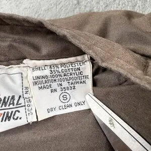 Materials (from tag): Shell 65% polyester, 35% cotton. Lining 100% acrylic. Insulation 100% polyester.