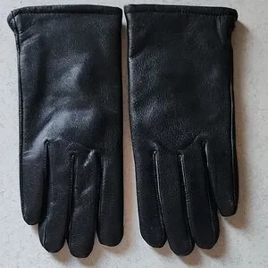 Elegant and durable black leather gloves for women. Perfect for adding a touch of sophistication to any outfit. Lined , measures 9" approx from end to tip of finger.
