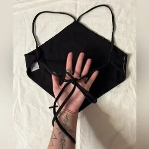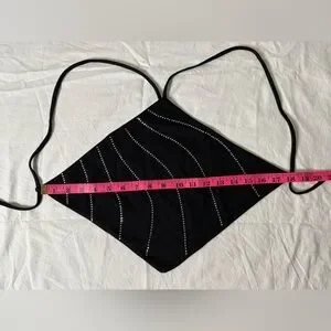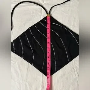 White Fox Black and Silver Rhinestone Halter Diamond Backless Top. Black with crystal rhinestone embellishments. Adjustable straps that start at the middle of the neck and cross in the back. Perfect for a festival, Vegas, date night. Like new. Size XS.