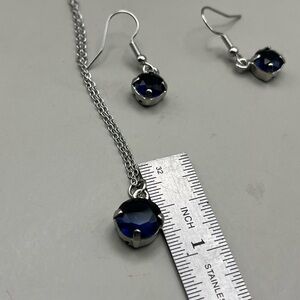 Elevate your style with this stunning silver necklace and earring set, featuring deep blue crystals that exude elegance and sophistication. The silver chain and matching earrings create a cohesive look that's perfect for dressing up or adding a touch of glamour to everyday wear. The round-cut blue crystals are securely set in four-prong settings, ensuring they catch the light beautifully. This versatile set is ideal for special occasions or as a thoughtful gift. Item 727