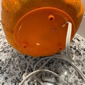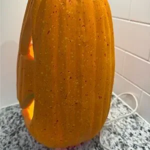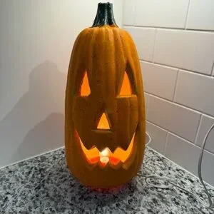 Brighten up your holiday decor with this festive orange Jack-O'-Lantern light. Perfect for creating a spooky atmosphere! Measures: 15” high ~ In gently used condition ~ working condition, includes “night light “ bulb. From a SMOKE / ODOR free home.