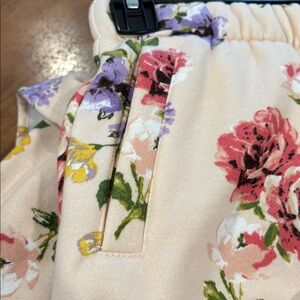 NET fb girls Stylish joggers with a vibrant floral print. Features red, purple, and yellow flowers on a cream background. Elastic ankles and two front pockets. From smoke free home.