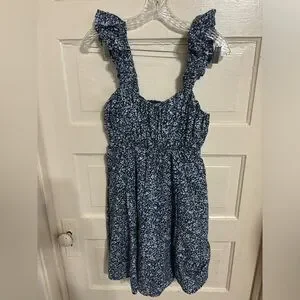 Charming blue floral midi dress. Features ruffled straps and a fitted bodice. Perfect for casual outings.