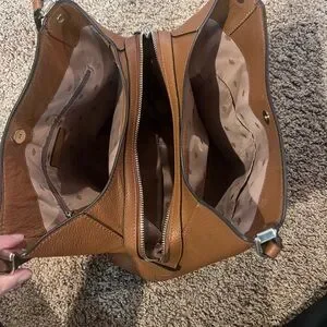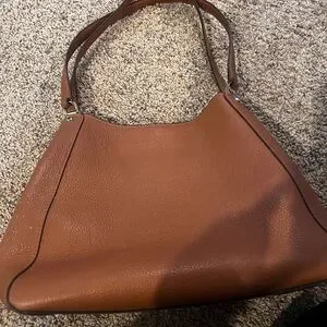 Chic Coach hobo bag in rich tan leather. Sleek design with a comfortable strap. Ideal for everyday use.