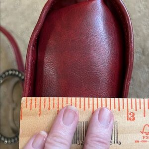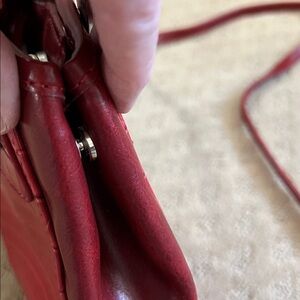 This red leather bag has embossed crocodile design with magnetic closure and metal heart shaped handles. This fun and unique bag looks like a Brighton but there are no identifying markings. Has removable crossbody strap and cute red and white heart lining. Interior has zip pocket and is very clean. Strap drop is 22 inches