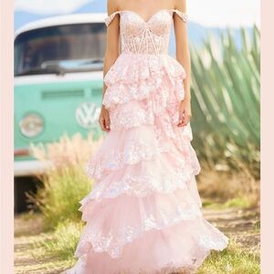 This dress is closely sparkling and such a gorgeous blush pink color. Hard to describe how beautiful it is in person! Elegant off-shoulder design. Layered lace with floral details.
