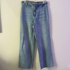 Trendy wide-leg jeans in a classic blue shade. Perfect for casual wear. Size 8/29. Distressed frays along bottom leg sleeves.