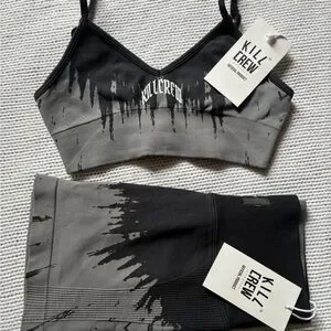 Dynamic black and gray sports bra and leggings. Bold design with Kill Crew branding.