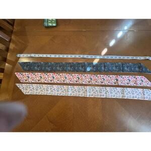 Set includes three skinny scarves with various designs: floral patterns and text prints.