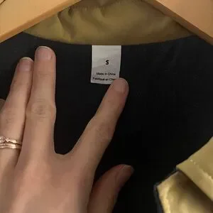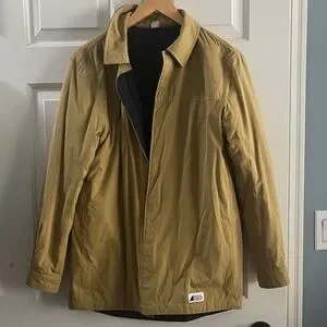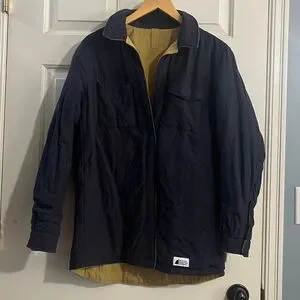 Jacket has a magnetic closure so it can be worn on either side! The tan side is more water resistant and the blue side feels like flannel. Woman small, like new