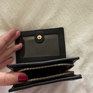 Sleek black leather design. Gold-tone logo accent. Ideal for organizing essentials.