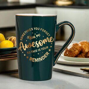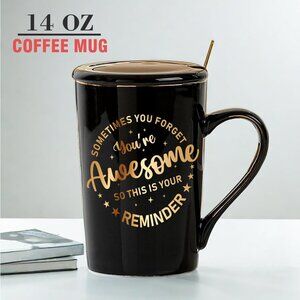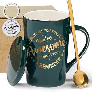Features: This cheerful ceramic mug features a motivational message, 'Sometimes You Forget You're Awesome,' in shiny gold text. It has a comfortable C-handle, anti-slip base, and safely holds hot or cold drinks. Includes a matching keychain, lid, spoon, message card, and a beautiful gift box — perfect for gifting at Thanksgiving or any special occasion.