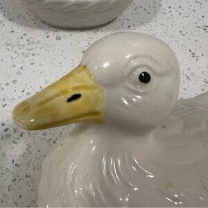 VINTAGE Ceramic Cream Duck on Nest White Woven Basket Japan Country Farm