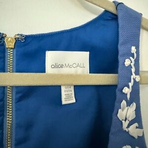 Chic mini dress in royal blue. Features delicate white floral patterns. Ideal for stylish outings.