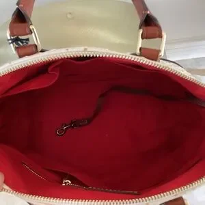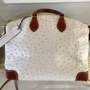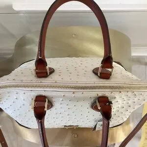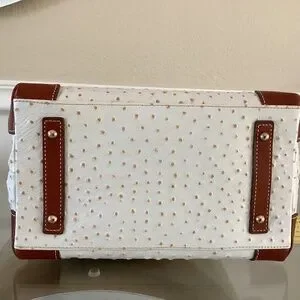 Dooney & Bourke White/Bone Ostrich Leather Satchel Bag Brown Leather Handles, Trim, Crossbody Strap Gold Hardware