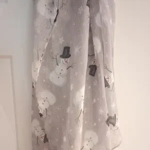 Add a whimsical touch to your outfit with this delightful scarf featuring a playful snowman design. Perfect for festive occasions.
