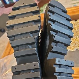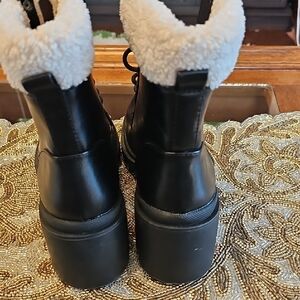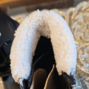 Stylish black combat boots with faux fur lining. Features lace-up front and side zipper. Perfect for a chic, edgy look.