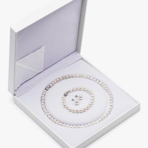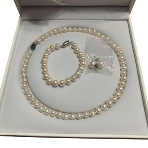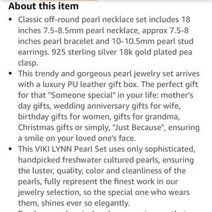 Classic off-round pearl necklace set includes 18 inches 7.5-8.5mm pearl necklace, approx 7.5-8 inches pearl bracelet and 10-10.5mm pearl stud earrings. 925 sterling silver 18k gold plated pea clasp.