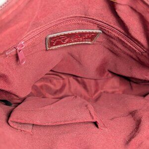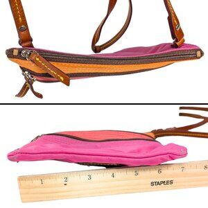 2. Dooney pink, red & orange nylon w/brown leather strap & accents. Good condition w/exterior marks & wear. Clean interior & leather. 3 bright yellow nylon-lined zip pockets. s/n J3877992