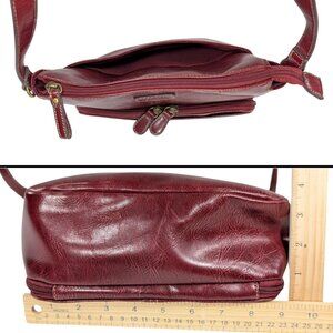 1. Relic Bordeaux red faux leather w/adjustable strap. Excellent condition. No flaws. 2 exterior slip pockets. 1 exterior double zip pocket w/6 card slots & 2 full-length dividers. Main interior is lined w/zip closure, 1 slip & 1 zip pocket