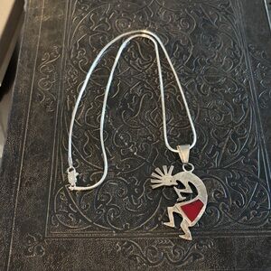 This exquisite artisan necklace features a silver Kokopelli pendant with a striking red accent. Perfect for adding a unique touch to your jewelry collection.