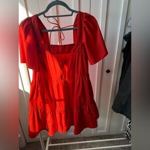 Chic scarlet dress with a stylish square neckline. Ideal for versatile wear. Minor little holes. Black stain on the strings, but will come off if washed. Has pockets. See pics. Color is more of a rust orange. Perfect for fall.