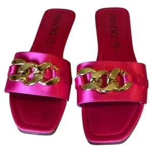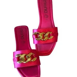 Step into elegance with these Mona B sandals, featuring a vibrant pink hue and a striking gold chain detail. The minimalist design with a flat sole and square toe offers a modern touch, perfect for semi-formal summer occasions.