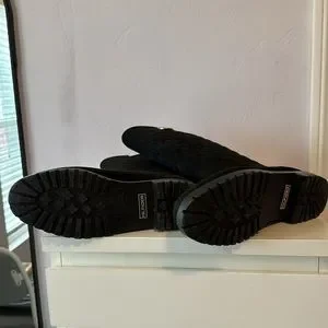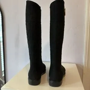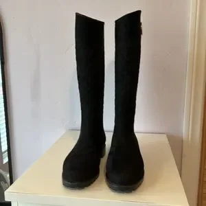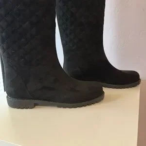 Stylish black quilted winter boots. Features gold logo detail. Perfect for cold weather.